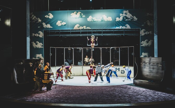 Také bylo zajímavé, jak byl ztvárněn led, na kterém hokejisté hráli: byla to bílá otočná plošina s jednou brankou a mantinely, která stála uprostřed pódia a herci se po ní klouzali jako po opravdickém ledě.