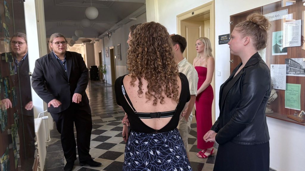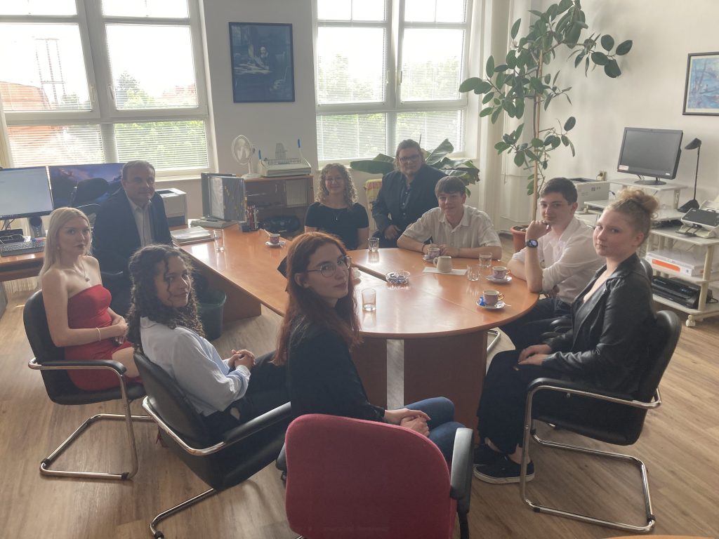 Následovala prohlídka prostorů školy a diskuze s vedením – panem ředitelem Mgr. Františkem Dubským a jeho zástupcem Mgr. Karlem Kabelkou. Výsledkem bylo zjištění, že stejně jako naše vedení i to jejich s nadšením podporuje studentské projekty a nechává studentům v rámci možností volnou ruku a prostor ke kreativitě. Další z věcí, které spolu sdílíme.
