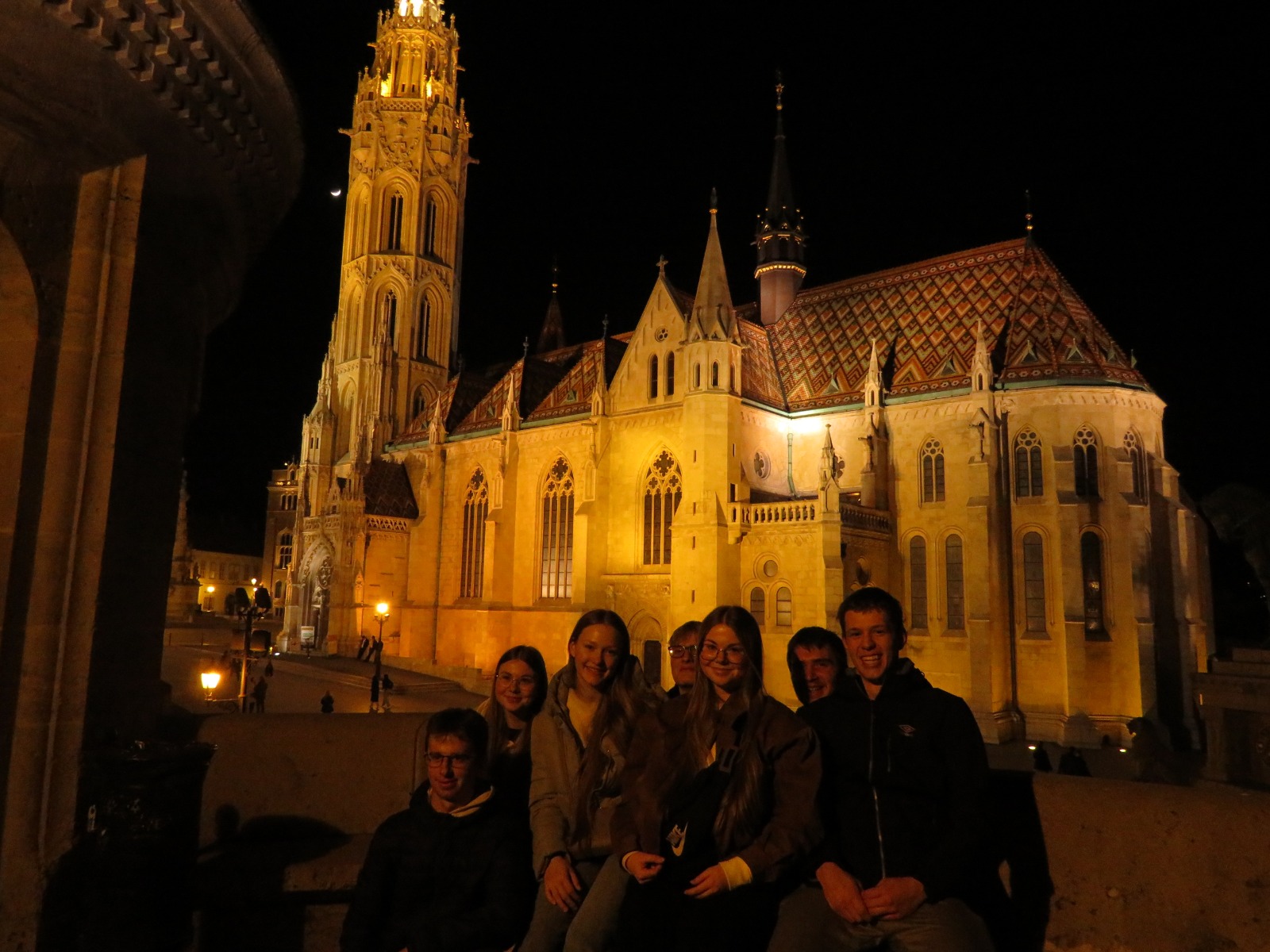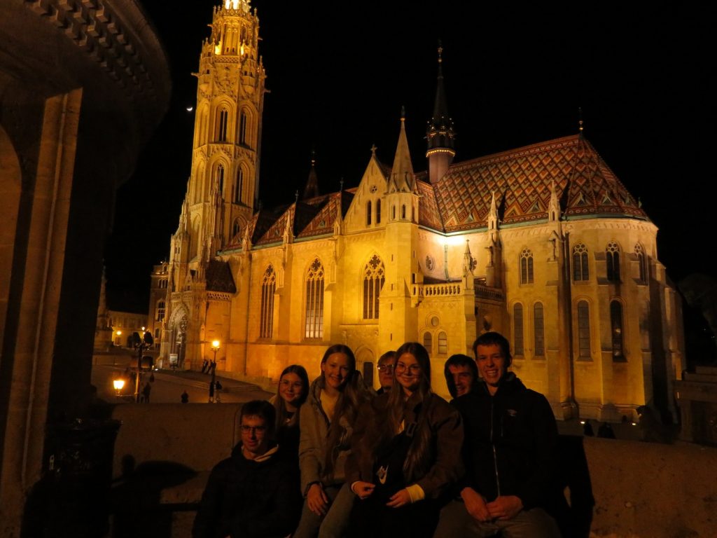 Když jsme vystoupili z vlaku, už z dálky jsme viděli maďarské studenty spolu s jejich paní učitelkou, jak se smějí a drží velký papír s nápisem „Telč“. To bylo opravdu překvapivé, ale o to vřelejší přivítání. Nebudeme si lhát, chvíli nám trvalo než jsme se dali do řeči, ale po pár minutách už každý znal svého výměnného studenta se kterým vzápětí odjel pryč směrem k jeho domovu. Někteří jeli autem, vlakem, metrem a někdo dokonce i lodí. Asi nikdo nečekal, že bude potřeba tolik úsilí na mluvení. Ale najednou nám na tom závisela celá konverzace, bez velkého prostoru na promyšlení vět. Vlastně celé odpoledne jsme strávili právě s Maďary u nich doma a až večer jsme se zase všichni setkali a konečně si česky mohli sdělit své první dojmy. Vzápětí jsme se vydali na procházku po večerní Budapešti, kde jsme viděli spoustu krásně osvícených památek.