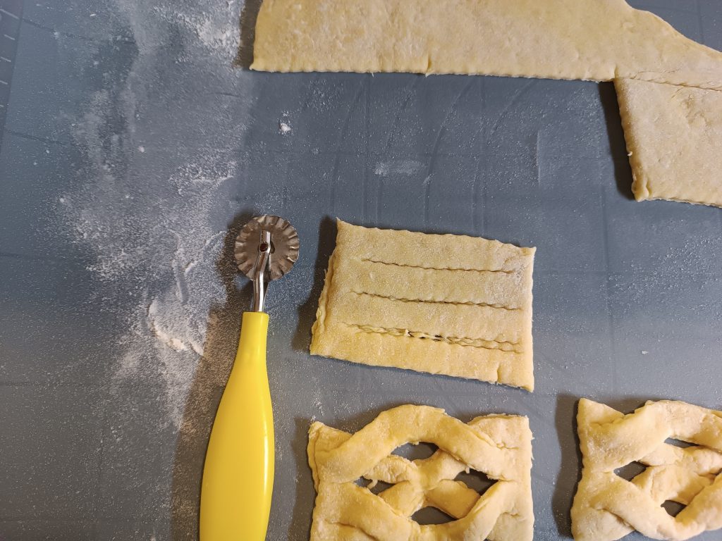 V misce smícháme mouku, žloutky, mléko nebo smetanu a špetku soli. Přidáme ocet s rumem, alkohol z rumu se odpaří, ale dává se tam, aby se do těsta nenasáklo tolik tuku. Díku tomu jsou Boží milosti křehké a nejsou mastné. Potom už těsto vypracujeme, aby drželo tvar a mohlo se na válu vyválet. Doporučuji si vál podsypávat moukou, aby se s těsto nelepilo a lépe se s ním pracovalo. Těsto vyválíme tenké asi jako na linecké, zkrátka pár milimetrů. Potom už rádýlkem (viz fotka) vykrajujeme obdélníčky.