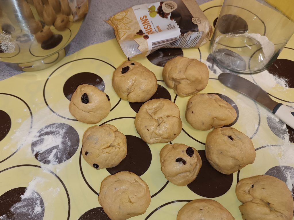 Vykynuté těsto na Hot cross buns rozdělíme na vále na stejné kousky a zakulatíme je. Foto: Kateřina Kozáková.